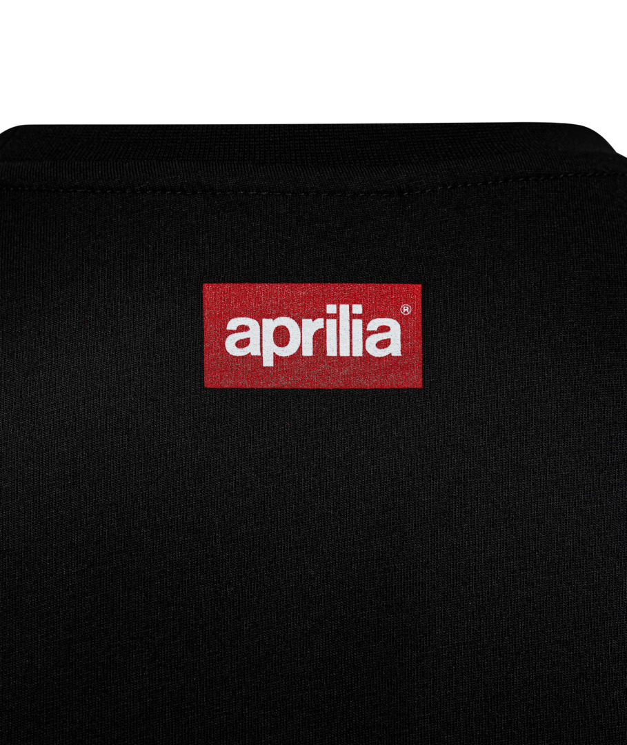 Escote redondo. Manga corta. Cuello de canalé. Cinta de algodón reforzada en el cuello. Logotipo de Aprilia impreso en la parte delantera. Logotipo de Aprilia impreso en la espalda. Aplicación en la manga con parche de PVC suave. Etiqueta de tela bordada con el logotipo de Aprilia.