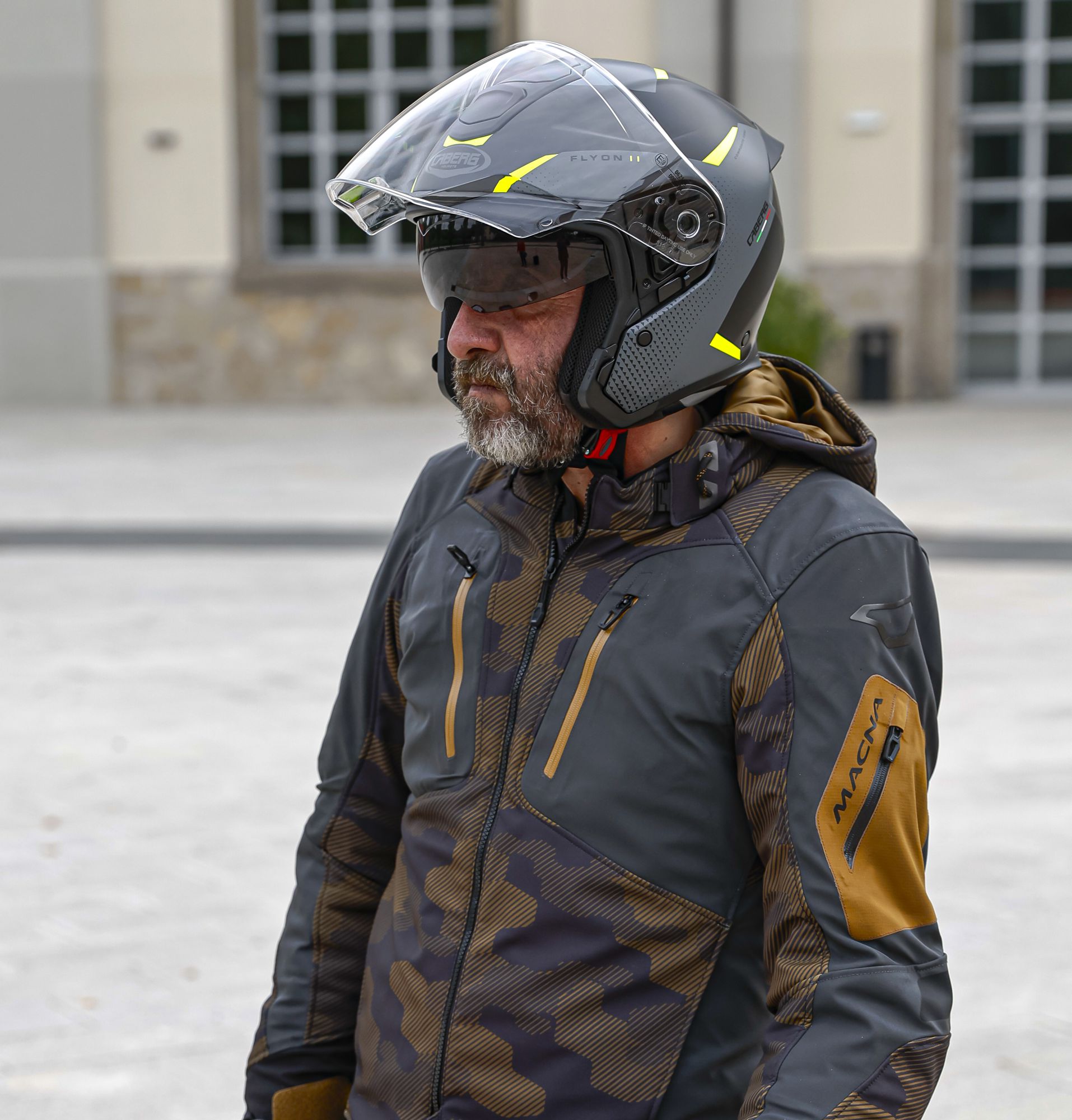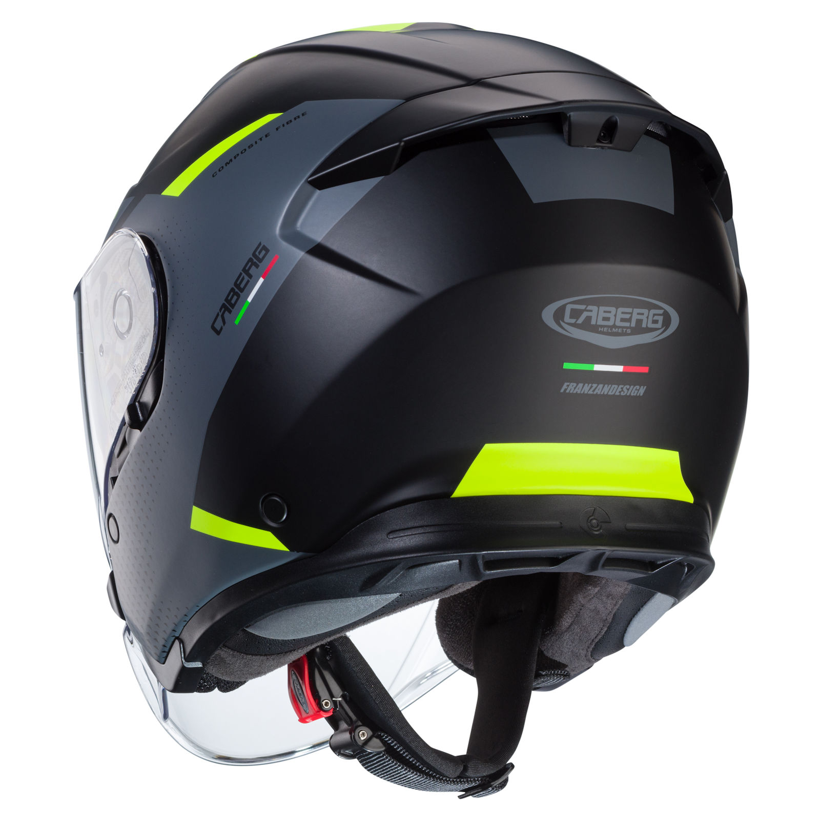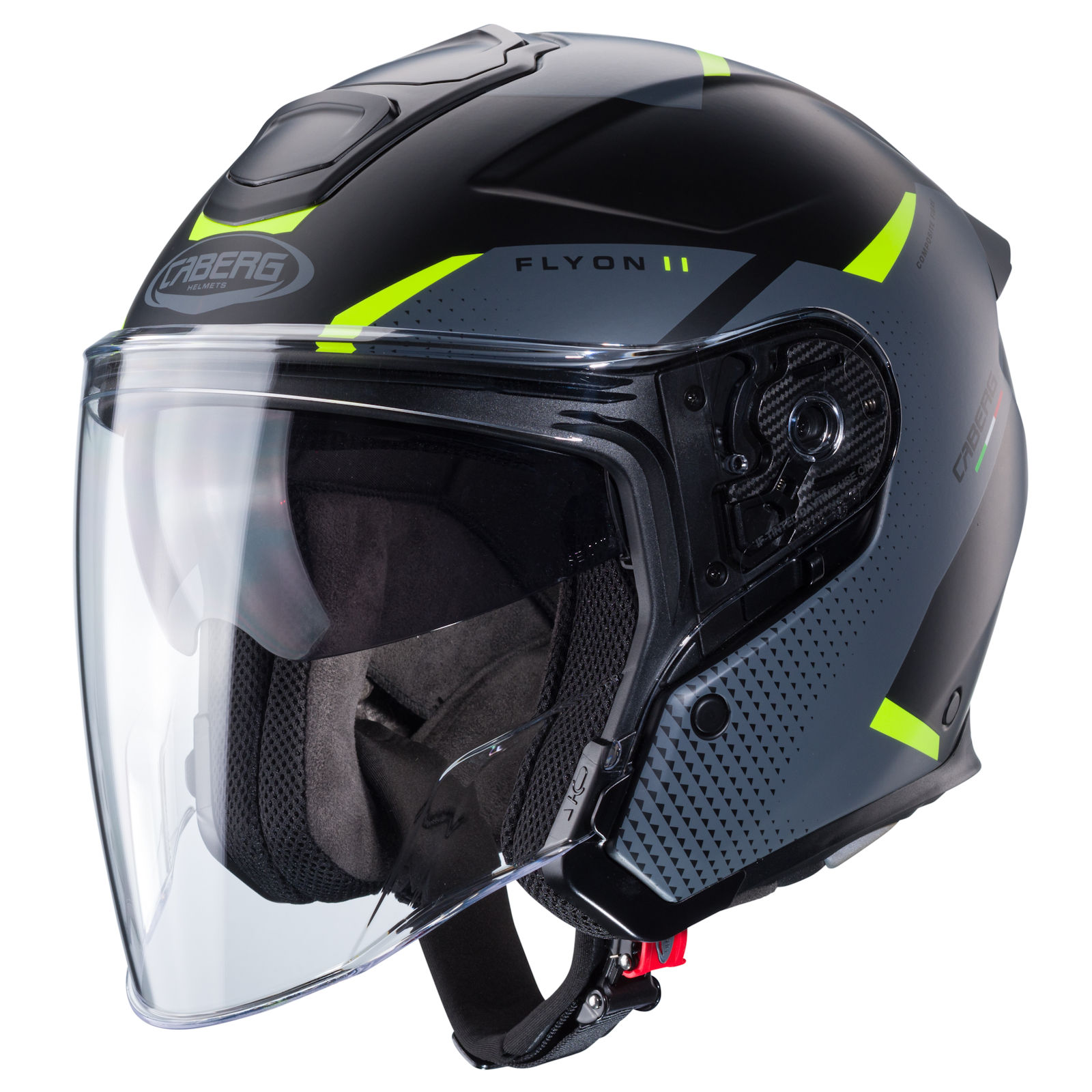 El casco jet Caberg Flyon II con la decoración Boss en los colores negro mate/gris amarillo fluo tiene las siguientes características: