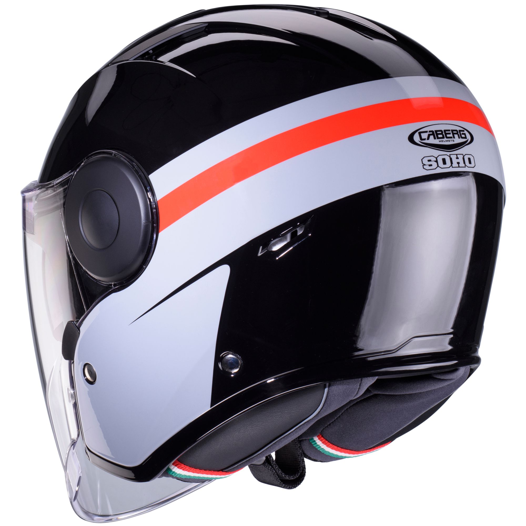 El casco jet Caberg Soho con decoración Zephyr en negro/gris-rojo tiene las siguientes características: