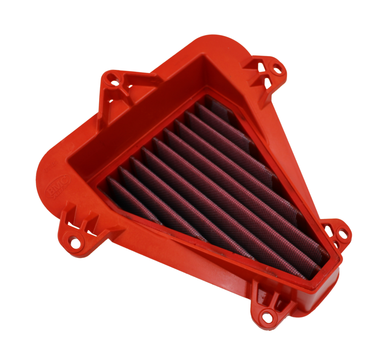 La construcción del marco del filtro BMC se fabrica mediante un proceso único denominado "moldeado completo". Esto permite fabricar el llamativo filtro rojo en un solo proceso de moldeo, sin necesidad de pegar las esquinas, lo que provocaría roturas. De todos los filtros disponibles en el mercado, el filtro de aire BMC tiene el material de goma que menos sobresale (menos de 6 mm), maximizando así la superficie filtrante.