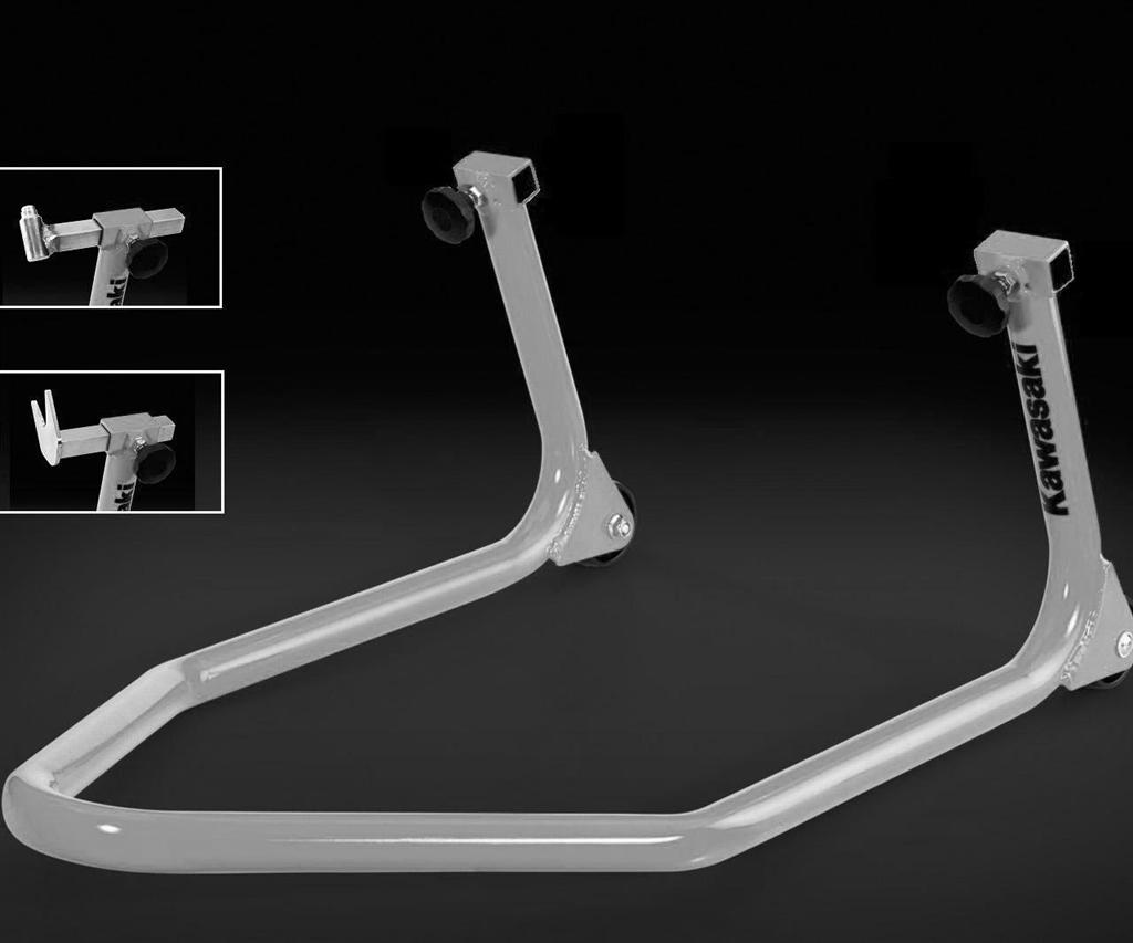 El Kawasaki Paddock Stand es adecuado para la mayoría de las motos de carretera. Debe combinarse con los pernos de la horquilla delantera o las horquillas en Y y las bobinas.