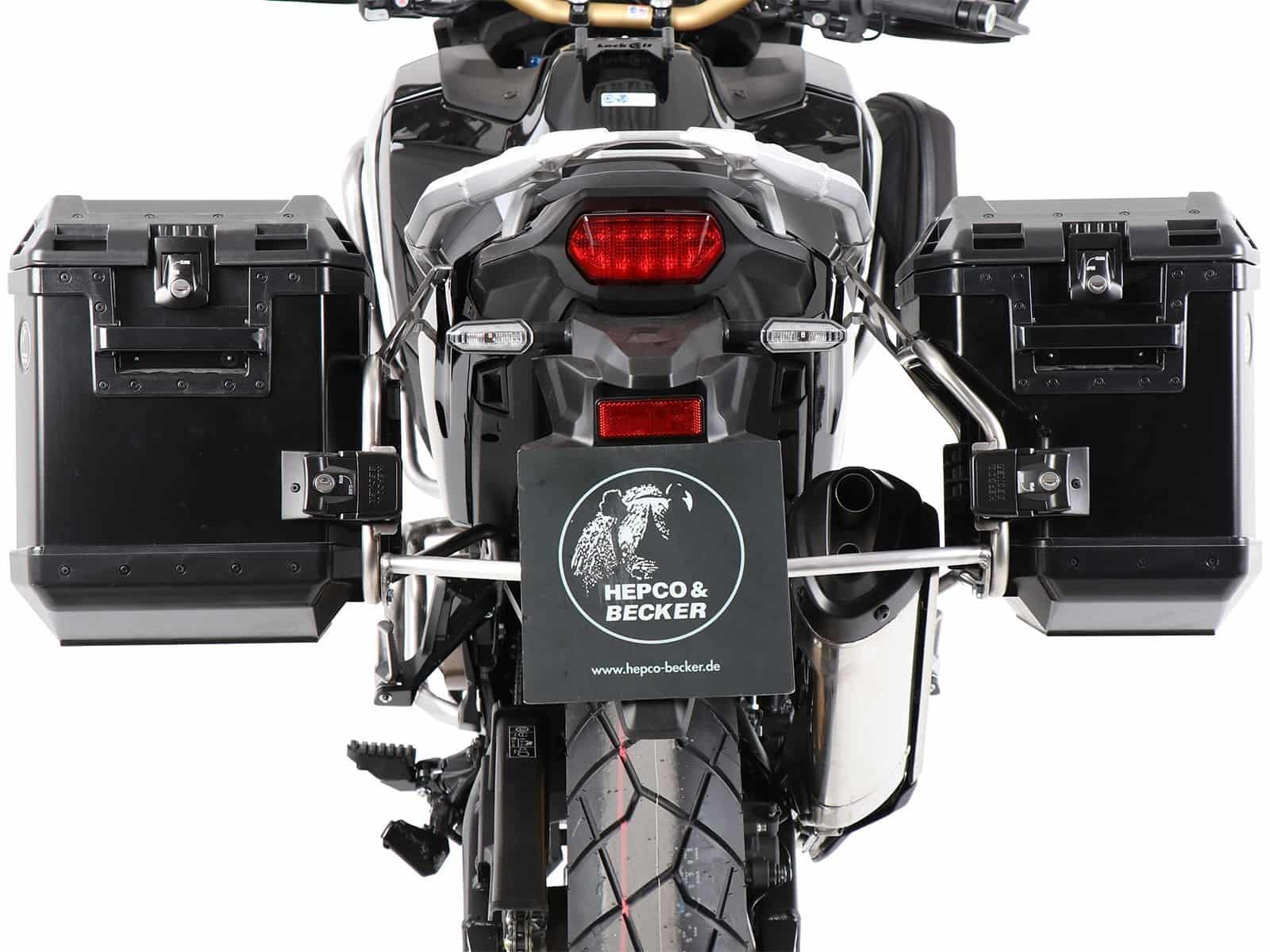 Juego compuesto por un portamaletas de acero inoxidable de doble cara, específico para cada modelo, en combinación con un maletín de 40 litros y otro de 37 litros empotrado, incl. llave, cilindro de cierre y los adaptadores de cierre necesarios para fijar los maletines al portamaletas.