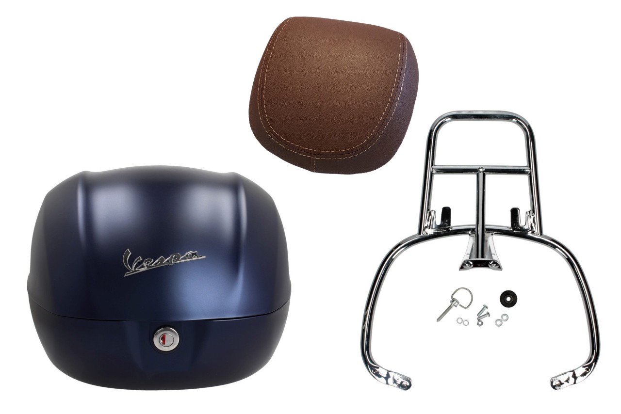 Kit baúl 32L azul oscuro opaco mate (288/A), cojín de respaldo marrón oscuro para Vespa Primavera