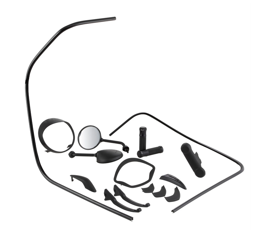 "De vuelta al negro" con los kits de estilo SIP para la GTS. El paquete todoterreno despreocupado incluye casi todas las piezas para deshacerse de los molestos cromados de la Vespa GTS. El kit de estilo SIP en negro mate para la Vespa GTS HPE incluye no sólo el característico tubo mono ranura, sino también espejos a juego, puños, manetas, nuestro anillo de luces SIP, anillo de velocímetro, inserciones en cascada, la boquilla del guardabarros de dos piezas de los antiguos modelos GTS y la tapa del basculante a juego.