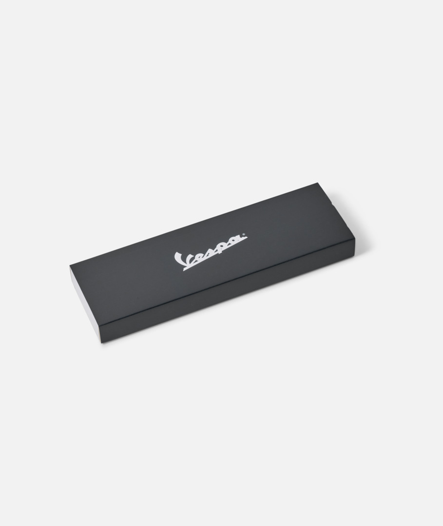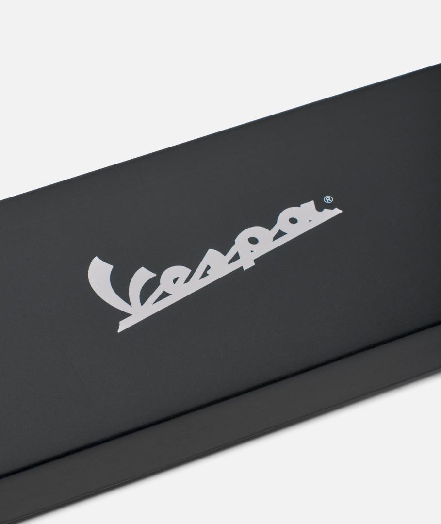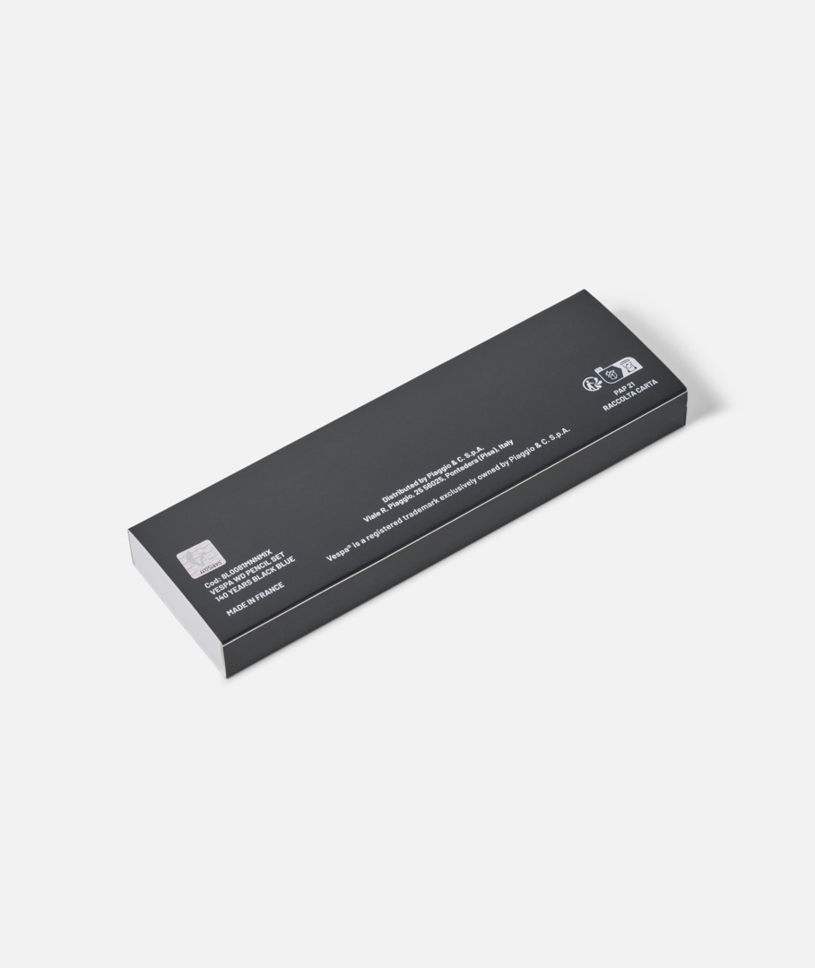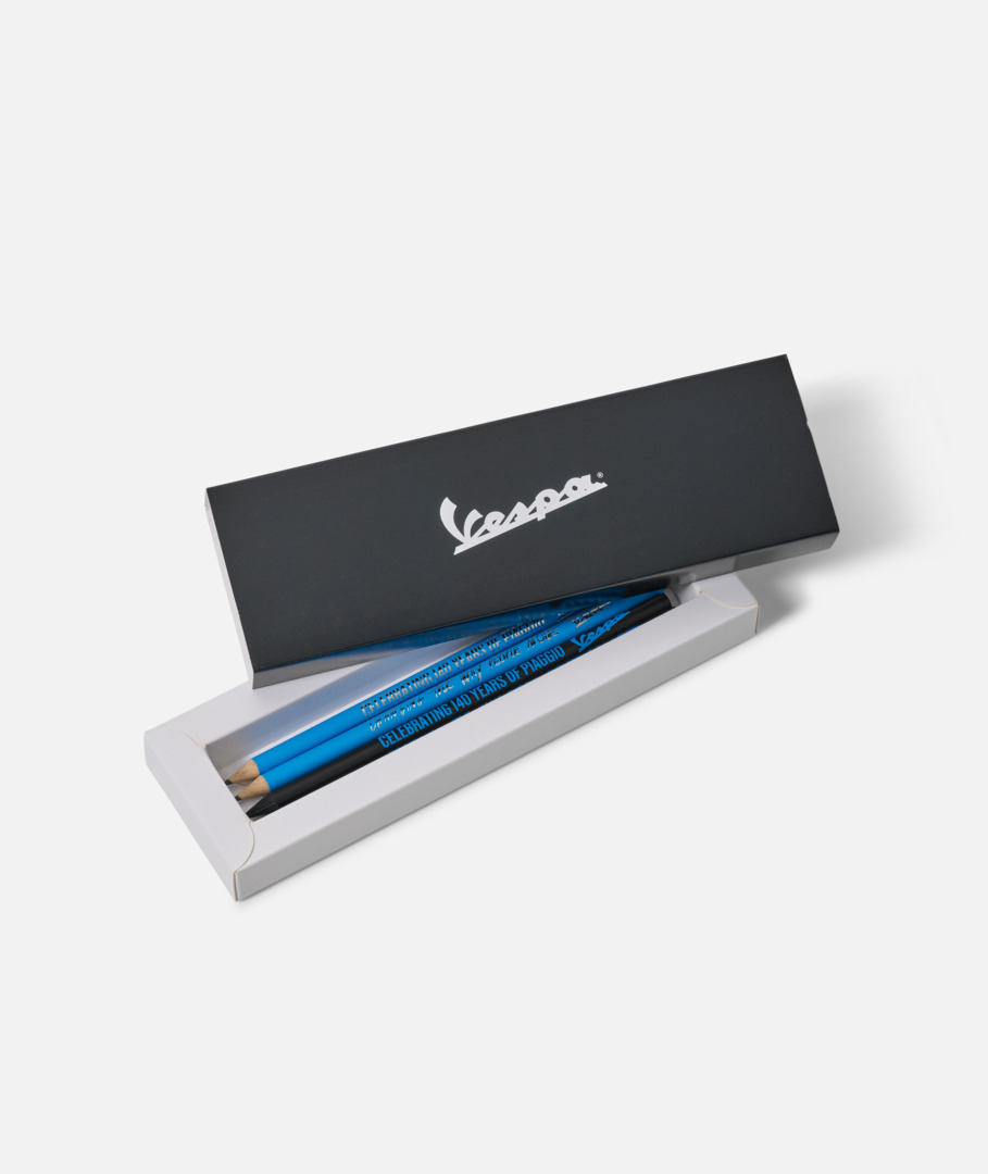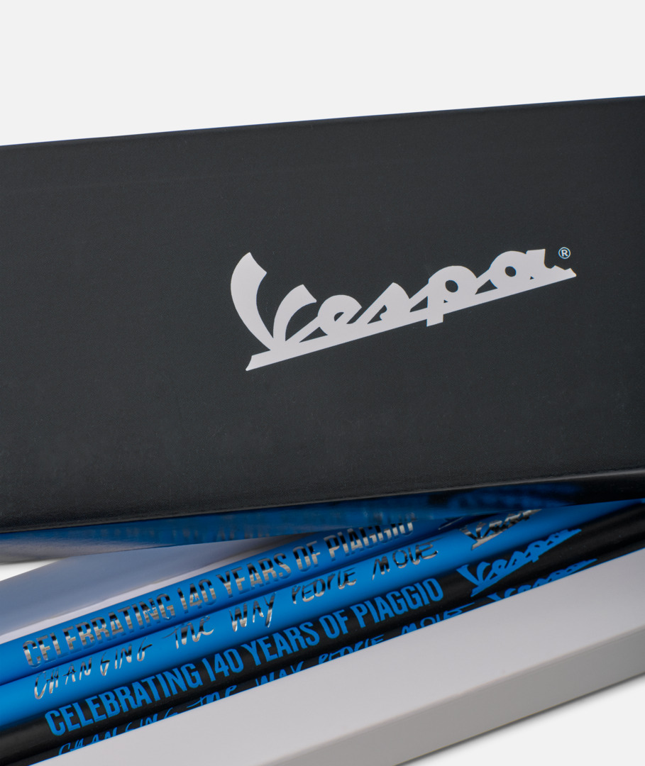 Juego de cuatro lápices HB con marco de madera lacada, con el logotipo de Vespa y una cita que celebra el 140 aniversario de Piaggio. Lápices con sección redonda y goma de borrar en la punta. Empaquetados en una caja de papel.
