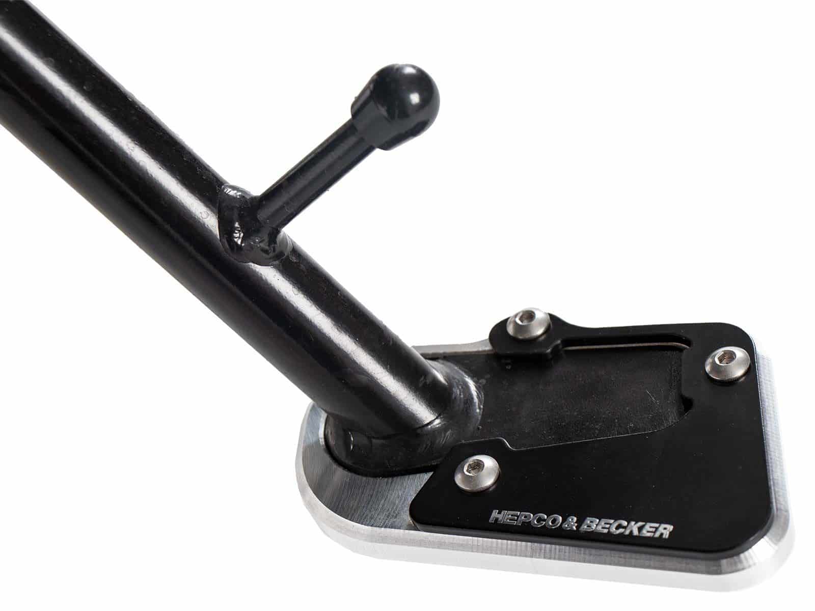 Especialmente cuando está completamente cargada o en superficies no pavimentadas, la moto puede hundirse y volcar fácilmente sobre el caballete lateral. Para liberar a tu moto de este peligro, te recomendamos una placa de caballete lateral moldeada específica para cada modelo de Hepco & Becker. Al ampliar el soporte del caballete lateral hasta aproximadamente el doble de superficie en comparación con el caballete original, tu moto queda perfectamente protegida de percances al aparcar.