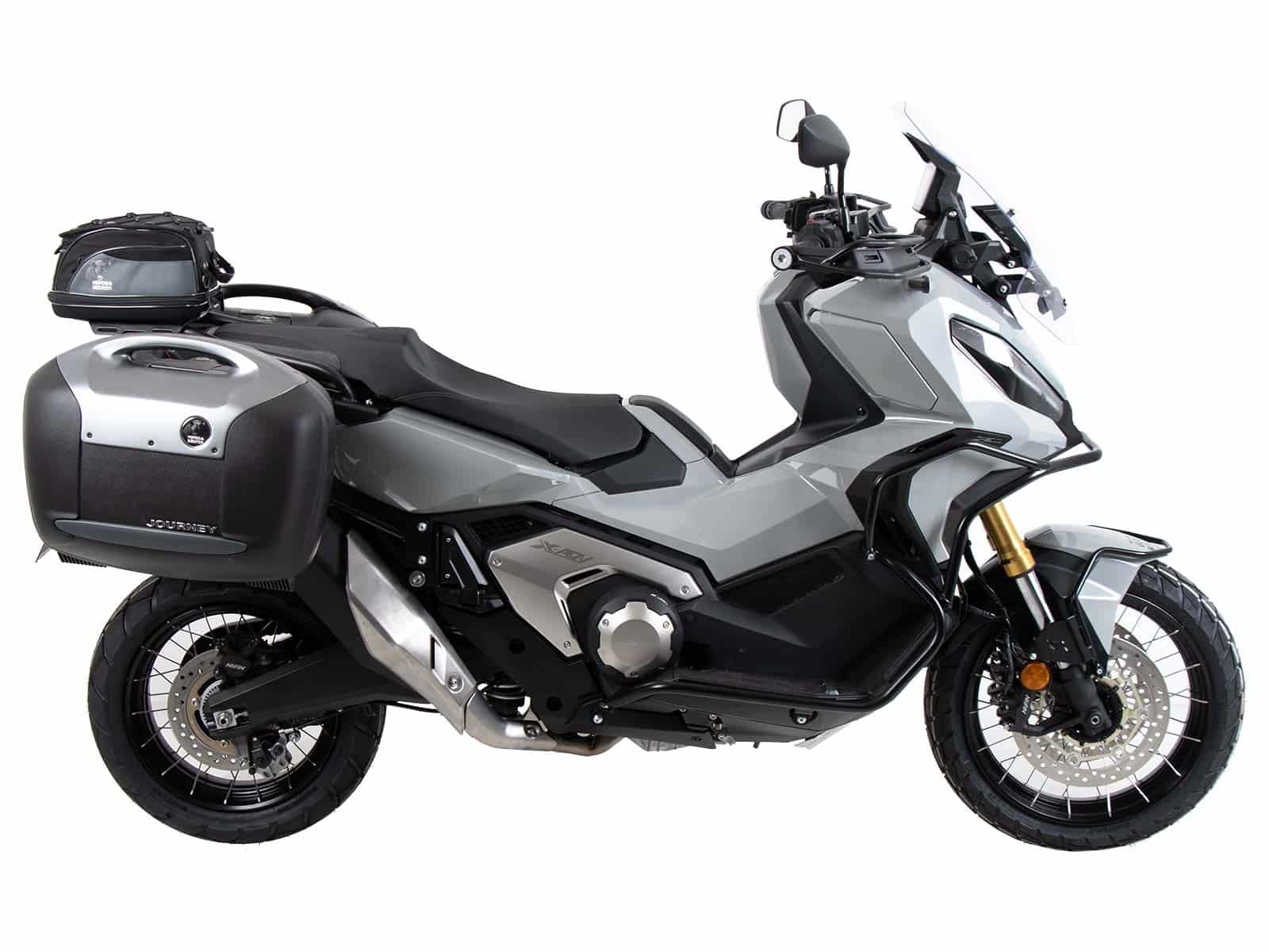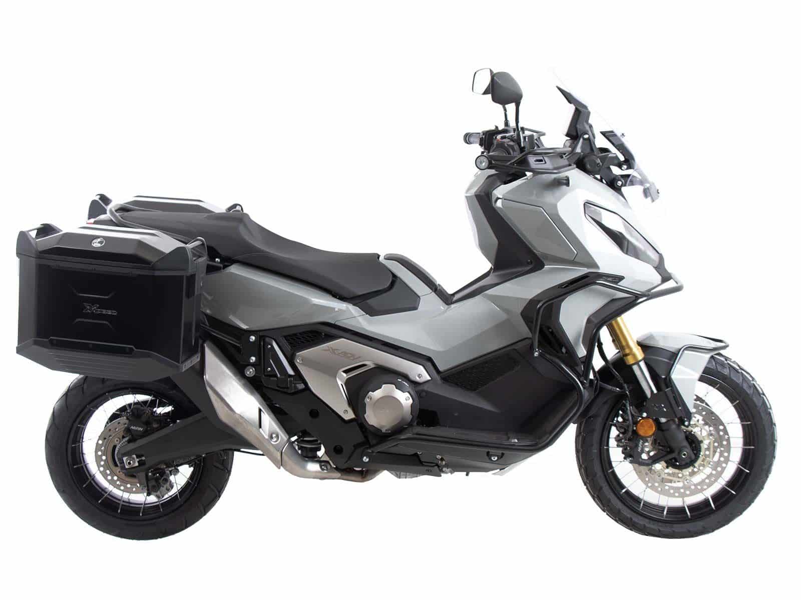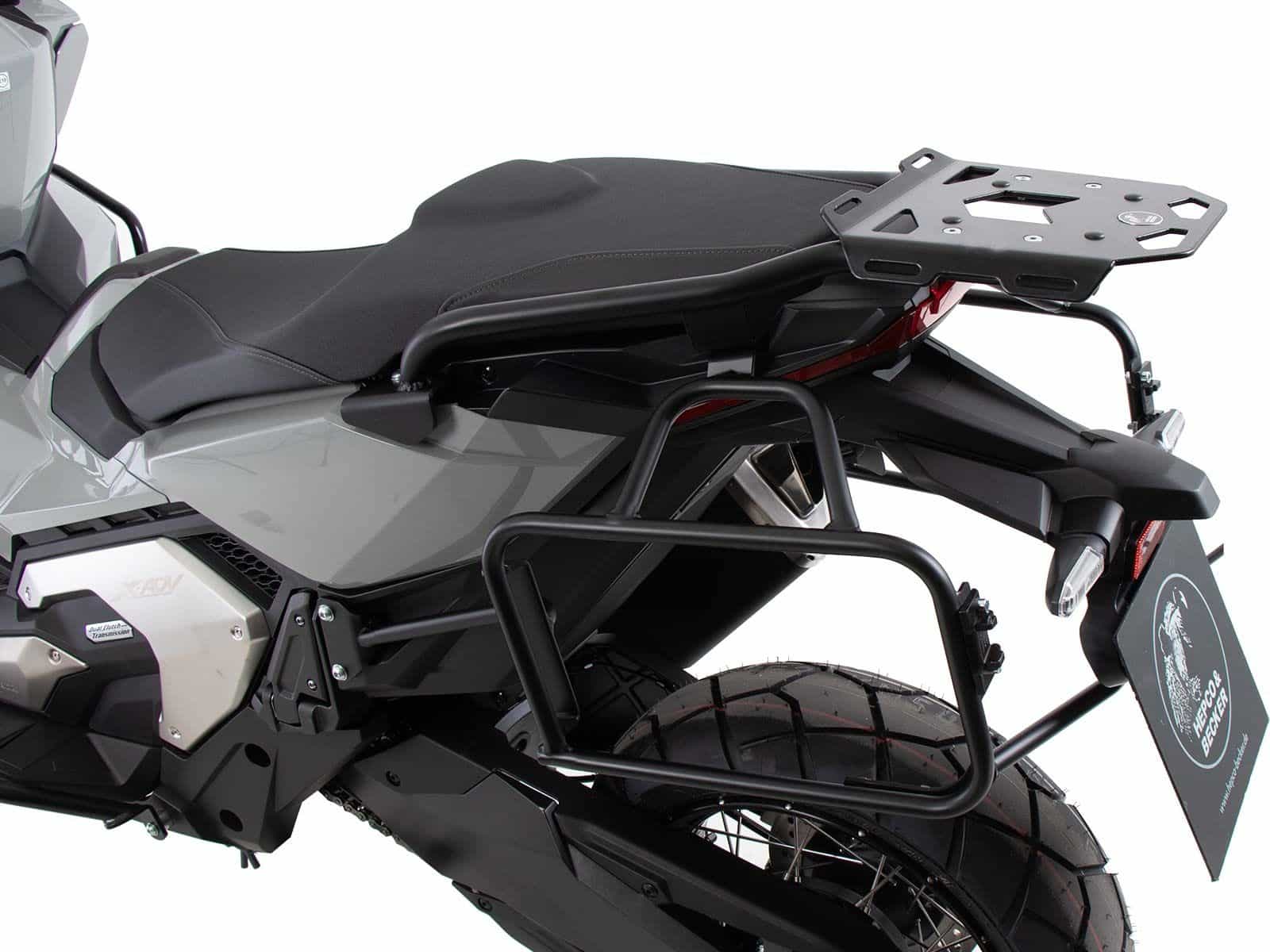 Los portamaletas laterales atornillados de Hepco&Becker se fijan firmemente al bastidor de la moto. Casi todos los sistemas de maletas laterales de turismo de Hepco&Becker encajan en este soporte. Las maletas se fijan al portaequipajes mediante un cierre metálico de retención para evitar robos. Para ello se necesita un adaptador de cierre adicional . Normalmente se suministra con las maletas laterales. Este adaptador de cerradura se atornilla a la derecha y a la izquierda del portamaletas, en la parte trasera, y sujeta la cerradura de retención de la maleta. Los portaequipajes específicos de cada modelo tienen un diseño sólido y ofrecen una protección eficaz para las piernas del motorista o del pasajero, incluso en caso de caída.