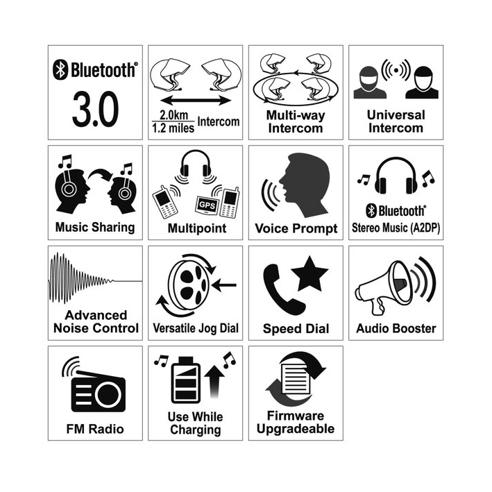 Puedes escuchar las instrucciones de voz de tu sistema de navegación para motos (Garmin Zumo/TomTom Rider/Becker Mamba4), conectar tu smartphone para hacer llamadas telefónicas o escuchar música.
