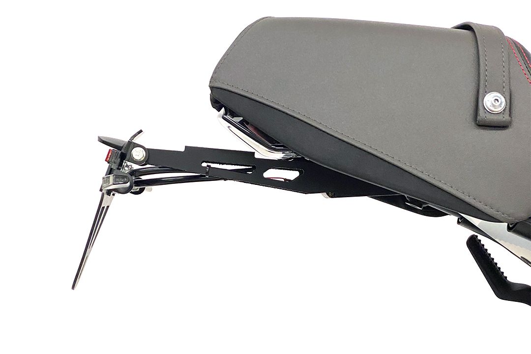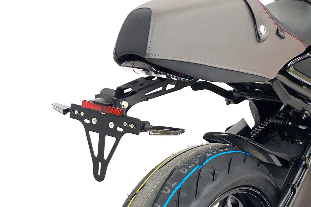 Soporte de matrícula para Yamaha XSR 900 / MTM890, tipo RN80, a partir del año de modelo 2022-. Para utilizar con intermitentes accesorios (rosca M8 y M10), luz de matrícula y reflector incluidos.