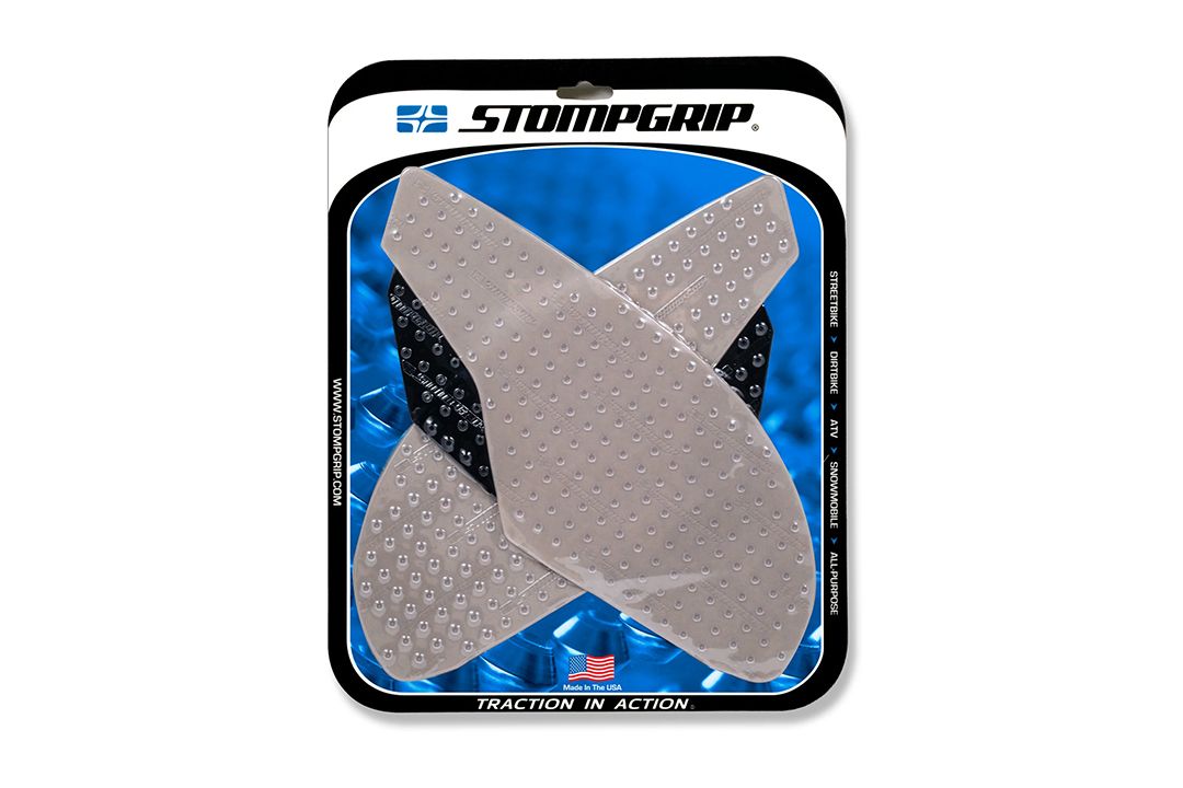 Las almohadillas de tracción Stompgrip se adaptan individualmente a cada moto. Si no dispones de una almohadilla Stompgrip adecuada, utiliza las almohadillas universales Stompgrip o córtalas a la medida que necesites. Las almohadillas están disponibles en negro o transparente.
