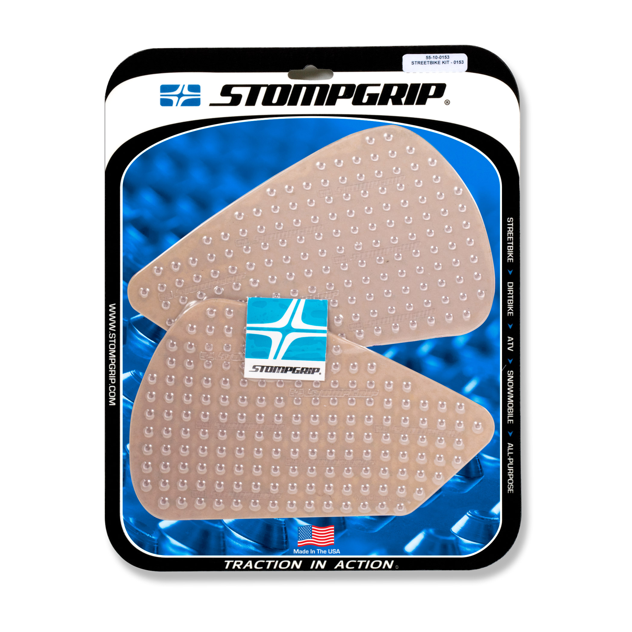 Las almohadillas de tracción Stompgrip se adaptan individualmente a cada moto. Si no dispones de una almohadilla Stompgrip adecuada, utiliza las almohadillas universales Stompgrip o córtalas a la medida que necesites. Las almohadillas están disponibles en negro o transparente.