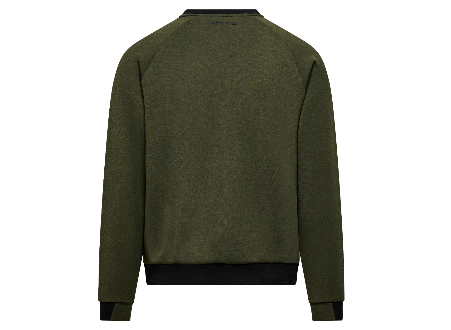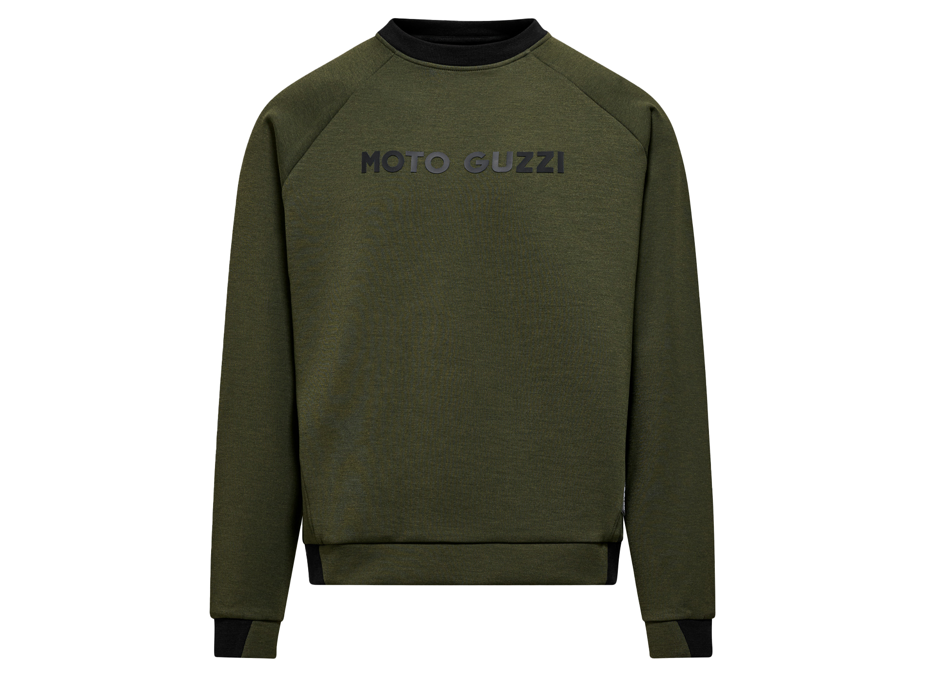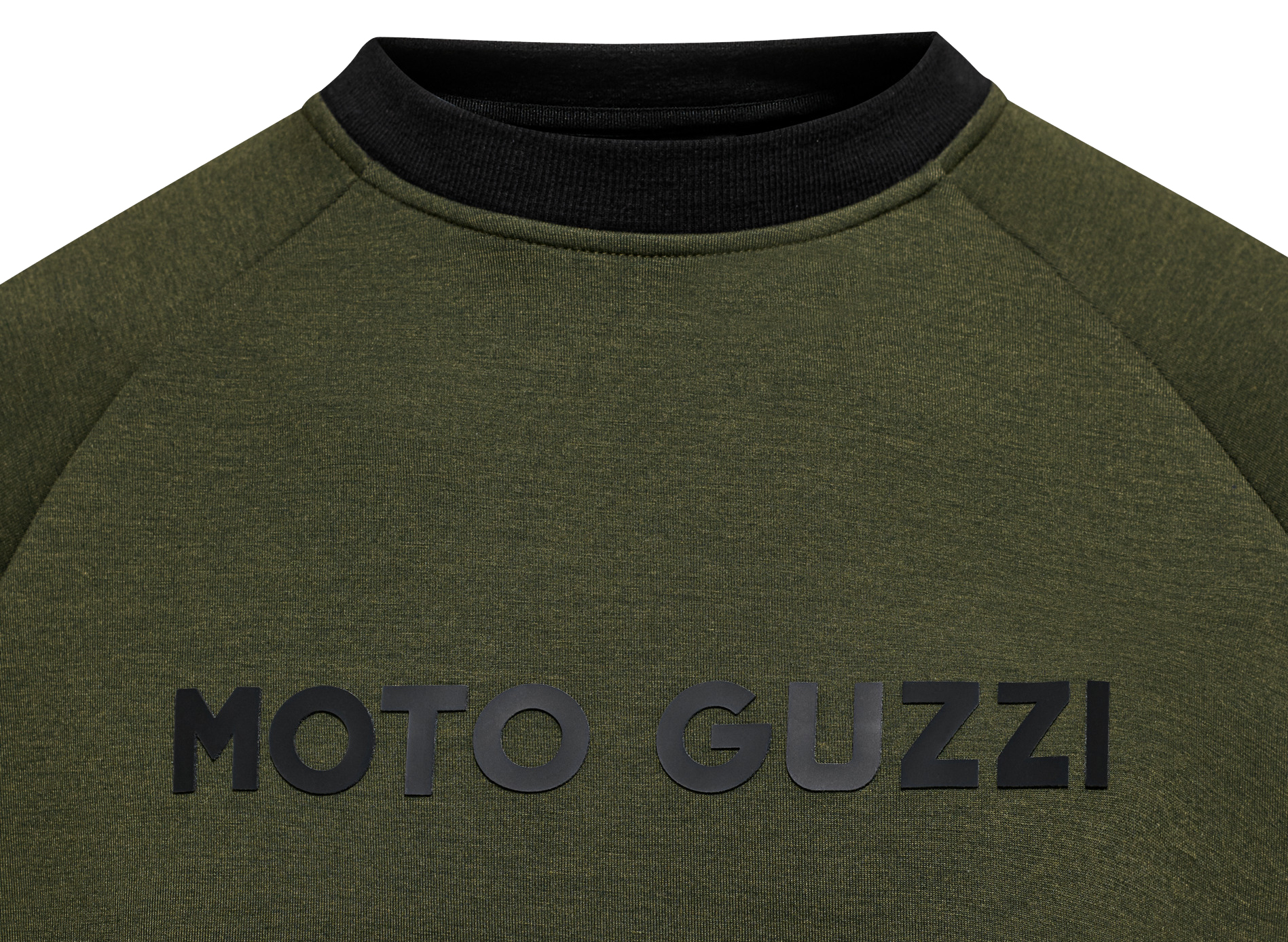 Sudadera confeccionada en material de escafandra con un llamativo estampado engomado en el pecho y la espalda. El logotipo MOTO GUZZI cosido en el lateral añade un acento especial. Cuello redondo de canalé en contraste. Las mangas raglán, los puños y el dobladillo de doble tejido en contraste garantizan estilo y comodidad, convirtiéndola en una prenda ideal para los amantes de la marca.